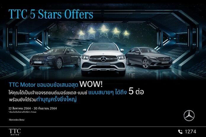 TTC 5 Stars Offers ข้อเสนอสุด WOW!! ที่ให้คุณได้เป็นเจ้าของรถยนต์เมอร์เซเดส-เบนซ์ แบบสบายๆ ได้ถึง 5 ต่อ* ต่อที่ 1 ผ่อนสบายๆกับ mySTAR ต่อที่ 2 ฟรี! ประกันภัยชั้นหนึ่ง 5 ปี ต่อที่ 3 Warranty 5 ปี ต่อที่ 4 เปลี่ยนถ่ายน้ำมันเครื่องฟรี! 5 ปีและ บริการรับ-ส่งรถเพื่อเข้าบริการที่ TTC Motor ฟรี! ตลอด 5 ปี พร้อมร่วมทำบุญครั้งยิ่งใหญ่ เมื่อลูกค้าออกรถเมอร์เซเดส-เบนซ์ 1 คัน TTC Motor บริจาค 10,000 บาท เพื่อ “กองทุนชัยพัฒนาสู่ภัยโควิด-19” , “เพจเราต้องรอด” , “โครงการเรื่องเล่าเช้านี้ช่วยเหลือผู้ประสบภัยโควิด” วันนี้– 30 กันยายนนี้
