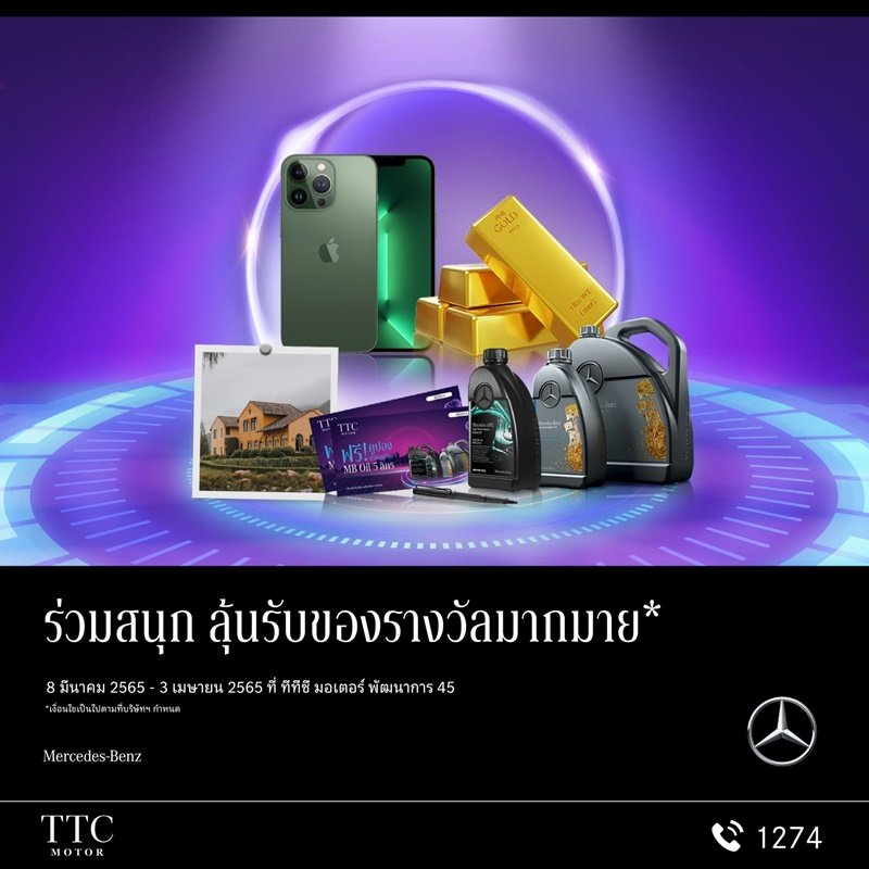 นอกจากนี้คุณยังจะได้ร่วมสนุก ลุ้นรับของรางวัลหลากหลาย ที่ TTC Motor ** อาทิ ทองคำ 1 บาท*, iPhone 13 Pro สี Alpine Green* , ห้องพักโรงแรมสุดหรูที่ Toscana เขาใหญ่* , คูปองน้ำมันเครื่อง MB Oil สูงสุดถึง 15 ลิตร* , ปากกา Lamy* และอีกมากมาย