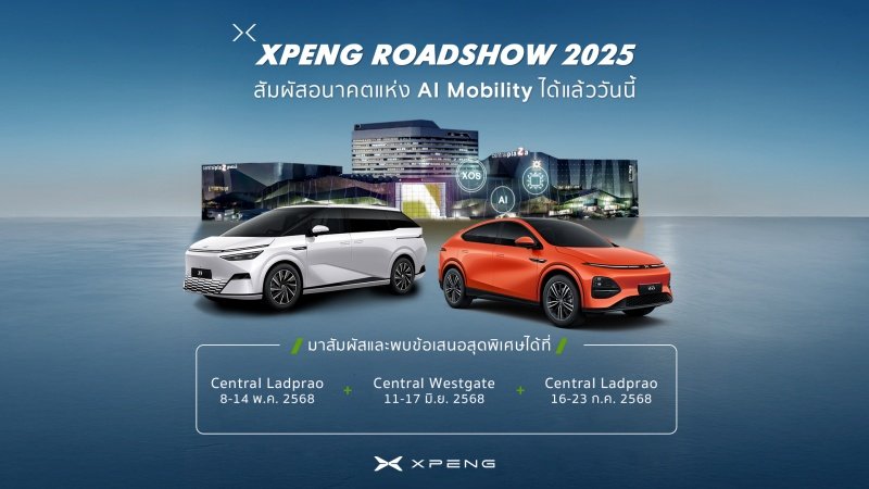 เชิญสัมผัสยานยนต์ไฟฟ้าอัจฉริยะระดับพรีเมียม-ไฮเทค ‘เอ็กซ์เผิง’ ในงาน XPENG ROADSHOW 2025ระหว่างวันที่ 8-14 พฤษภาคม ชั้น 1 โซน C เช็นทรัล ลาดพร้าว, วันที่ 11-17 มิถุนายน ชั้น 1 โซน P1F เซ็นทรัล เวสต์เกต, วันที่ 19-25 มิถุนายน ชั้น 1 โซน Mega Plaza เมกา บางนา และวันที่ 16-23 กรกฎาคมนี้ ชั้น 1 โซน B เซ็นทรัล ลาดพร้าว